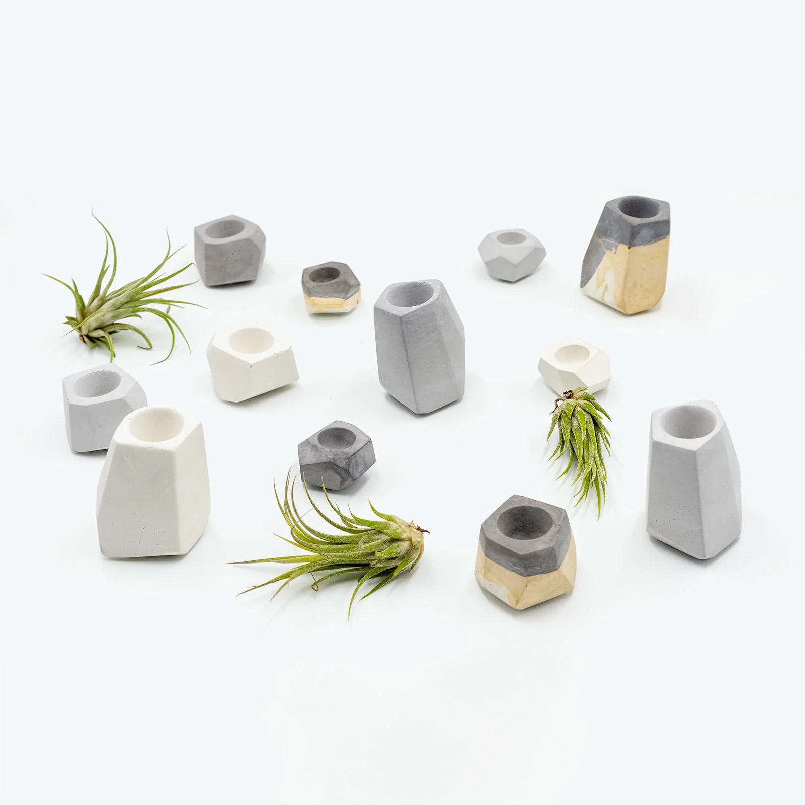 This set is a trio of assorted Air Plants and matching Concrete Bases to display them on. The base comes with two options. One is the classic artsy white colour. The other one is random colour, they may come in all three different colours or three identical colours of our choices.