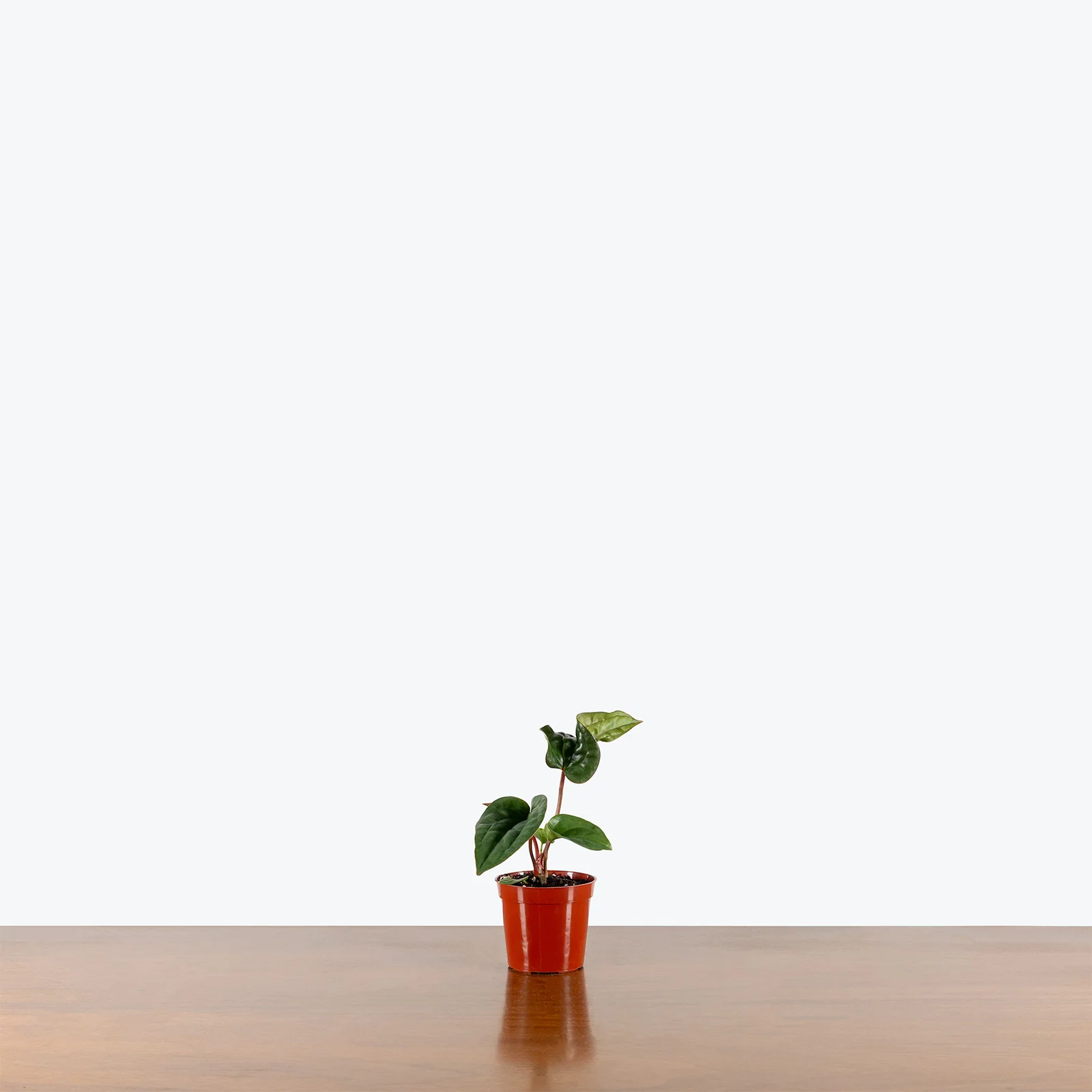 Anthurium Radicans x Luxurians is a sterile hybrid between two species: Anthurium radicans, which has heart-shaped leaves with pointed tips, and the wider, more oval Anthurium luxurians. Thanks to its parents, this hybrid is known for its showy foliage. Its large, thick, and bullate leaves emerge pink and develop into a deep, rich green complemented by deep red to brown petioles. It is a great beginner Anthurium, as it is well adapted to being kept as an indoor plant.