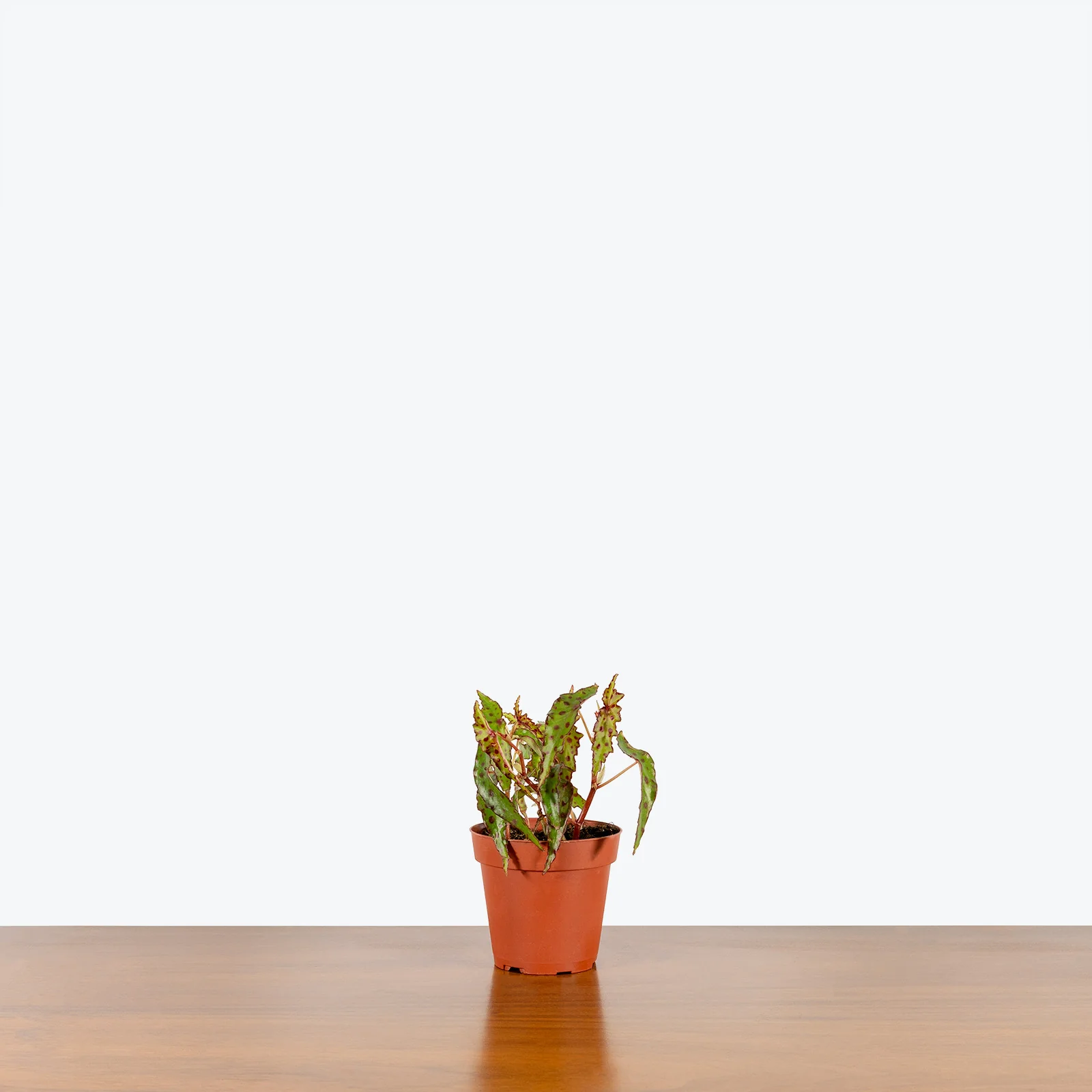 Begonia Amphioxus, also known as Begonia Amphioxus ‘Butterfly’, Pink Spotted Begonia or Polka Dot Begonia, has beautiful, crimson markings on the vivid green leaves resembling butterfly wings. It is an exotic begonia with a shrub-like growth habit. The leaves are lance shaped and pointed at both ends. The large maroon spots on the narrow green leaves give it an “other worldly” appearance. The flowers are green and have an unusual shape but not very showy.