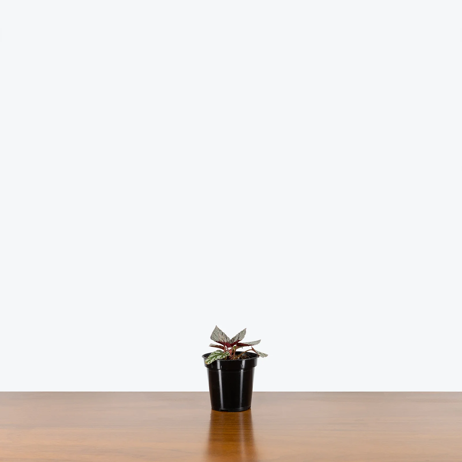 Rex Begonia 'Silver', aka Painted-Leaf Begonia or Fancy-Leaf Begonia, is a lovely, small-leaved cultivar of Rex Begonia with a compact growth habit. Each leaf is covered in stunning metallic silver, with the odd green or purple spotting along the veins, and contrasting burgundy undersides. Although they can produce blooms, they are grown for their beautiful, showy foliage.