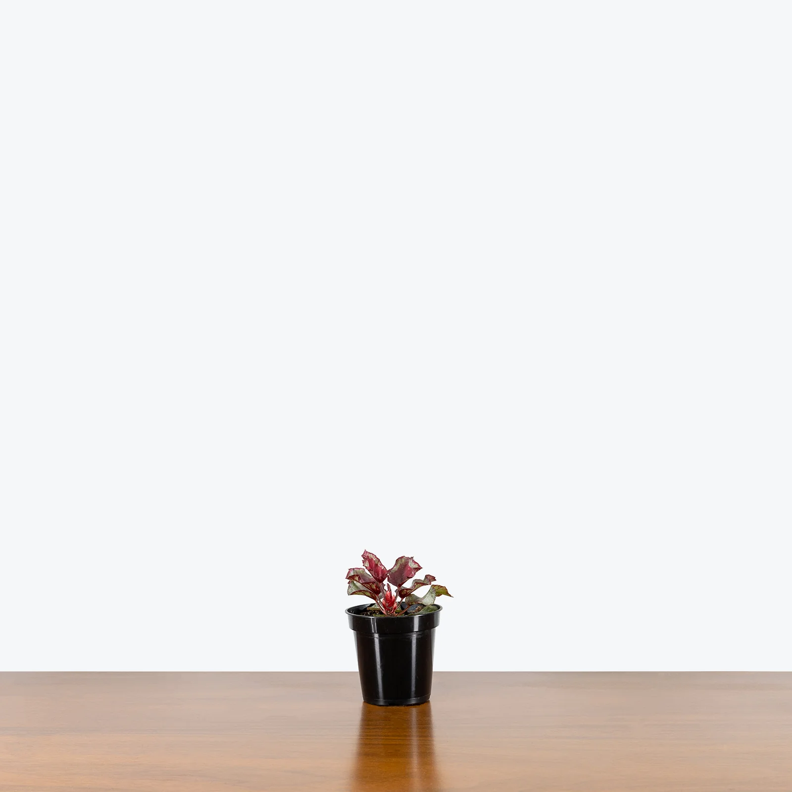 Rex Begonia 'Spitfire', aka Begonia rex ‘Spitfire’ Painted-Leaf Begonia, or Fancy-Leaf Begonia, is a beautiful cultivar of Rex Begonia with a compact growth habit. Each leaf displays a bright red center with silver and red bands along the outer ruffled edges. Although they can produce blooms, they are primarily grown for their beautiful, showy foliage.